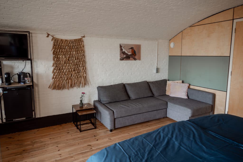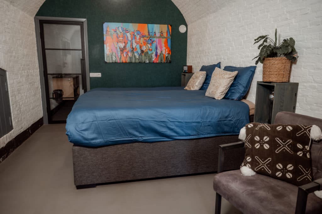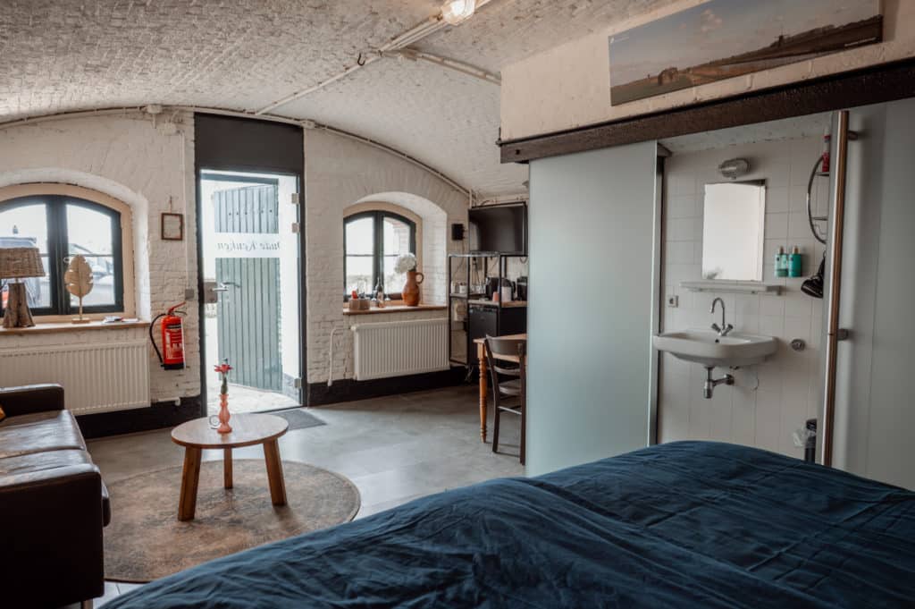 De kamer in het fort, oorspronkelijk gebruikt voor kanonnenopslag en het voorbereiden van kanonkogels, combineert historische details met hedendaags comfort.